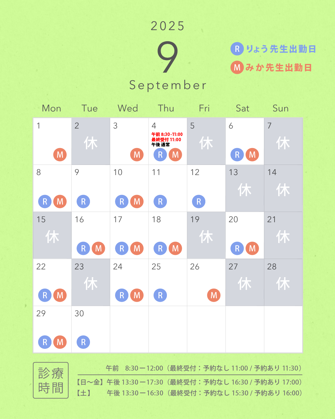 りょう先生休み 5,14,15,16,17,19みか先生休み 1,3,8,11,23,25,29,31