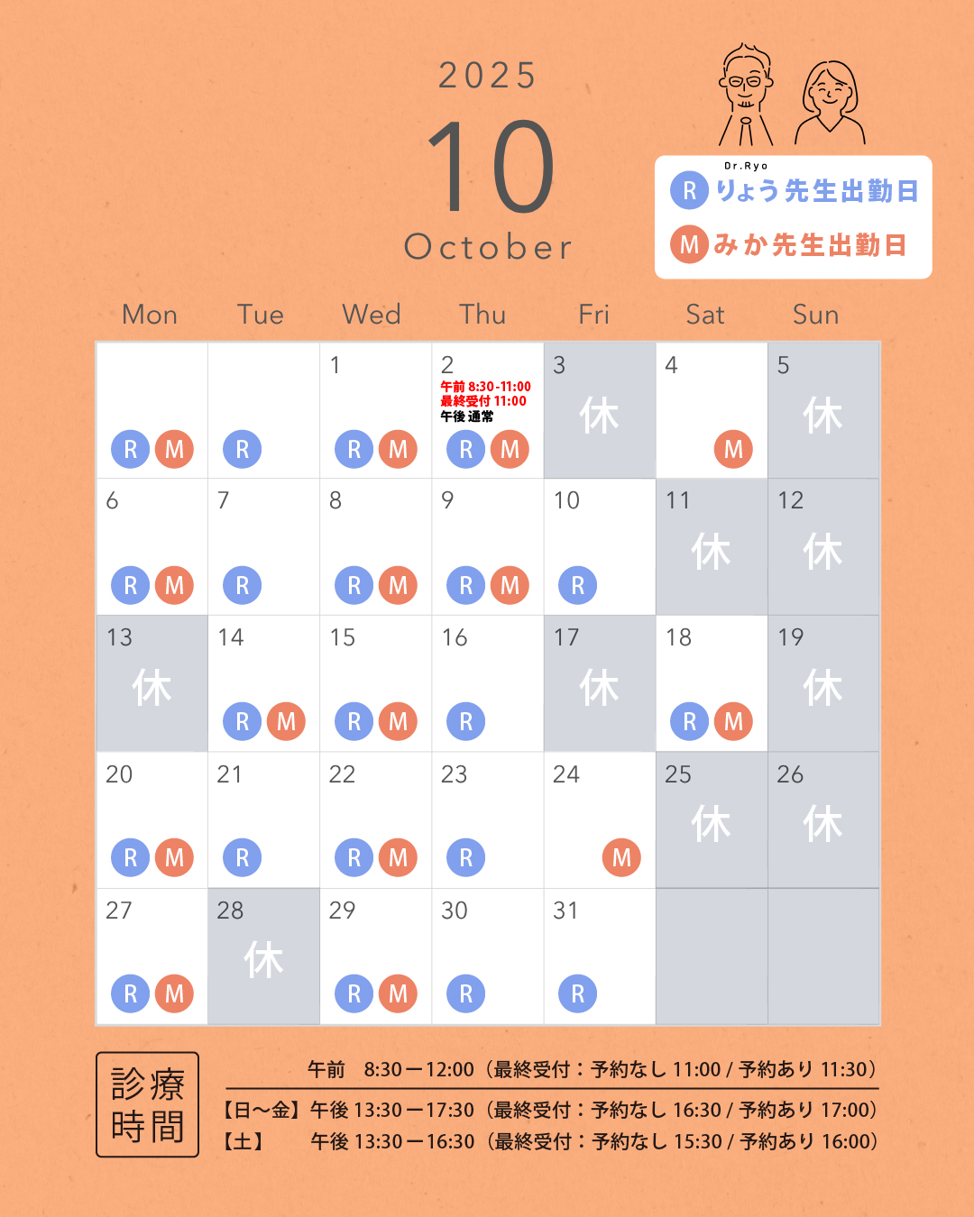 2日(木)院内ミーティングのため:午前8:30~11:00(最終受付11:00)、午後は通常診療